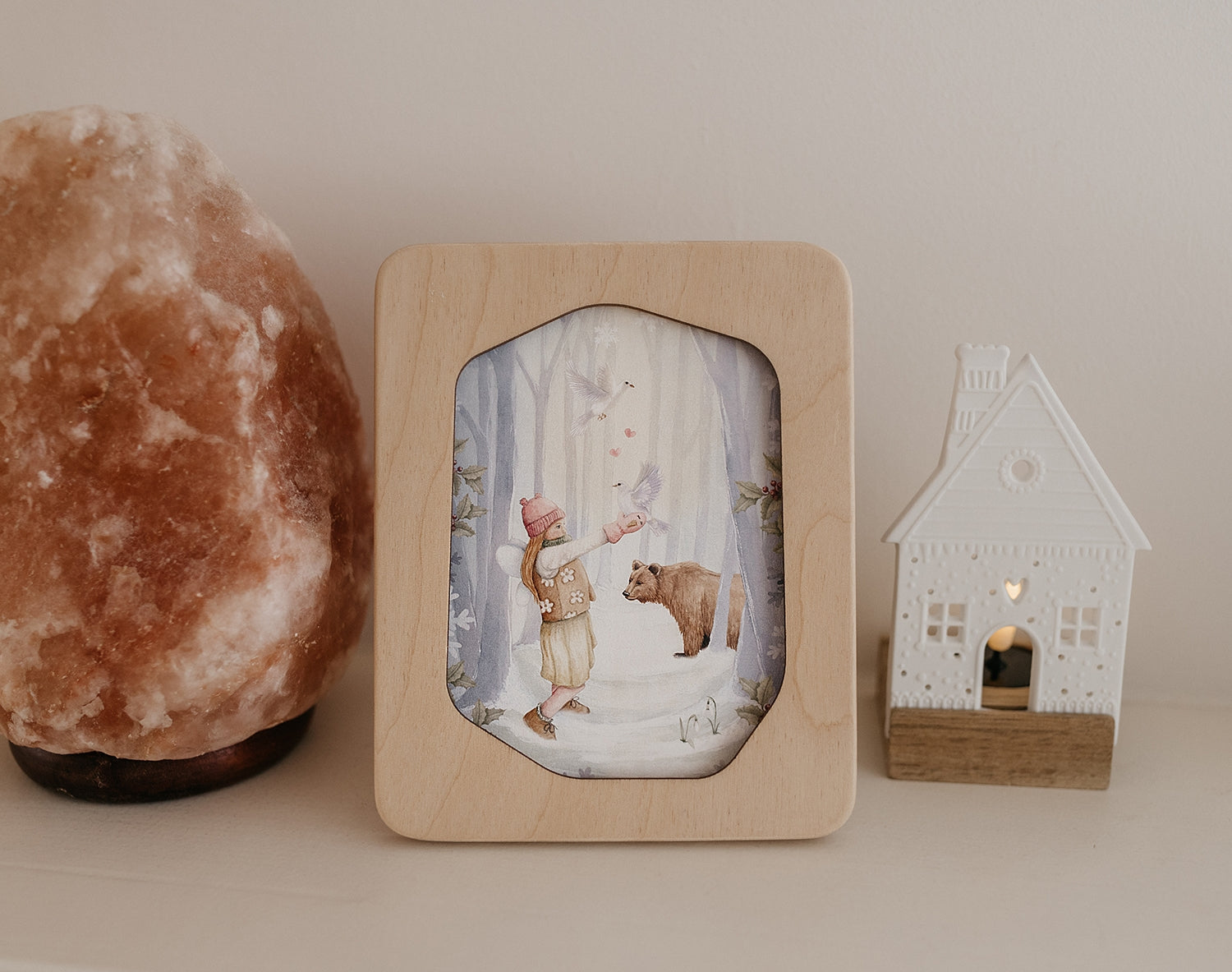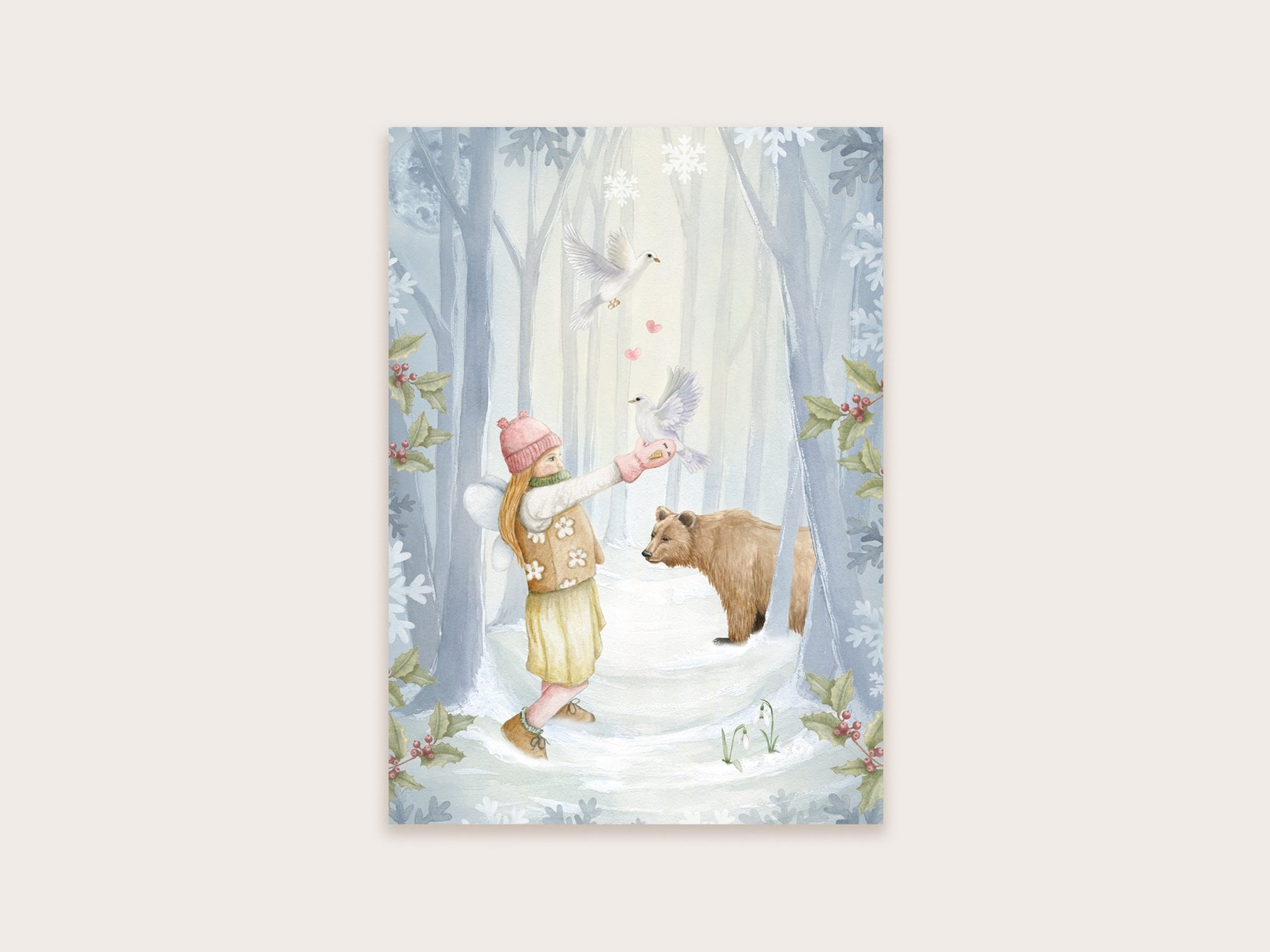 Breng een vleugje wintermagie in huis met de A6 Ansichtkaart – Winterbos met Duiven. Deze prachtige kaart toont een sfeervol besneeuwd bos, waar een meisje en een beer vredig wandelen tussen duiven. Perfect om een warme groet te versturen of als decoratie in je interieur.
