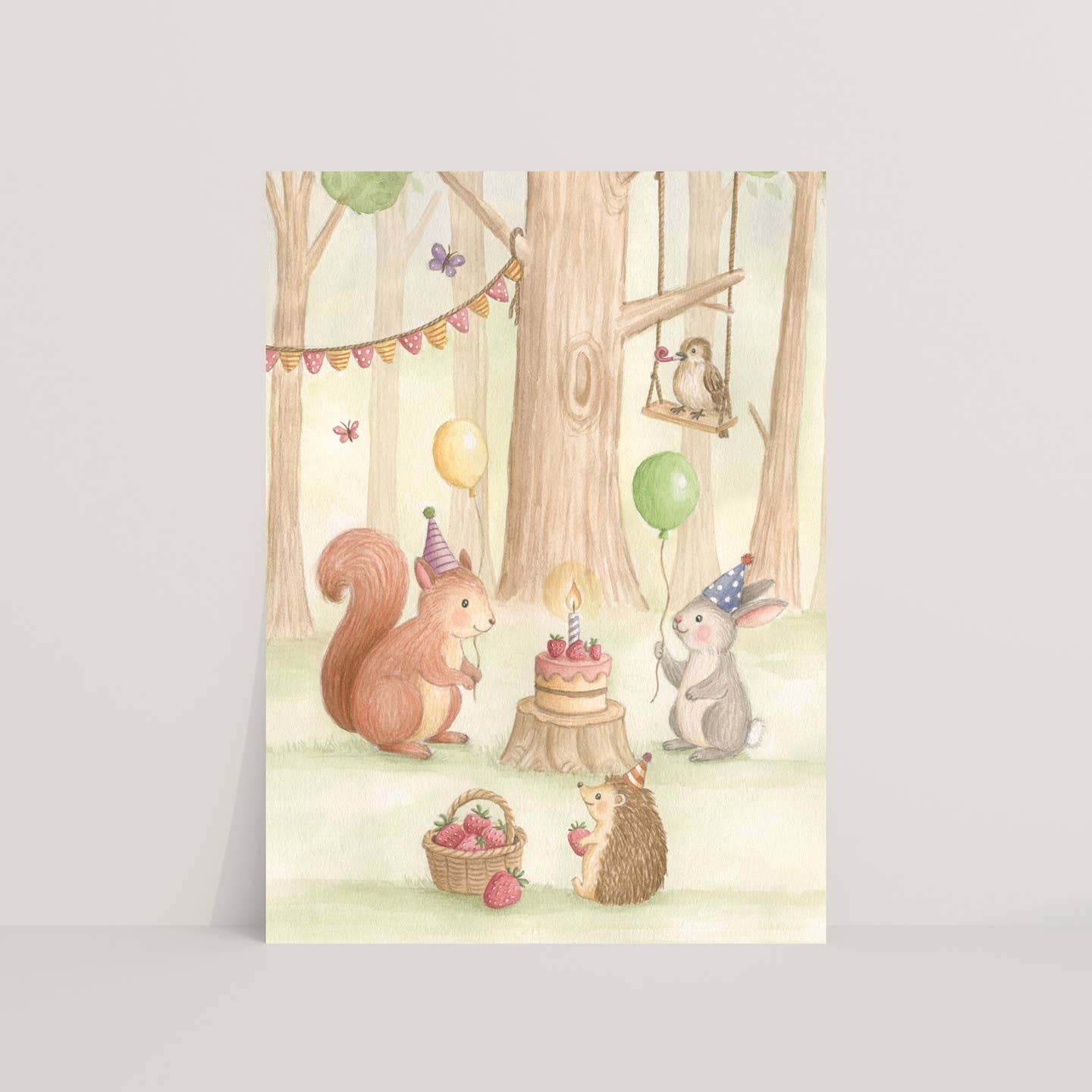 A6 kaart (10,5 x 14,8 cm) gedrukt op 300 grams papier met een gezellige verjaardagsillustratie van bosdieren met taart en ballonnen. Illustratie gemaakt met waterverf en potlood.