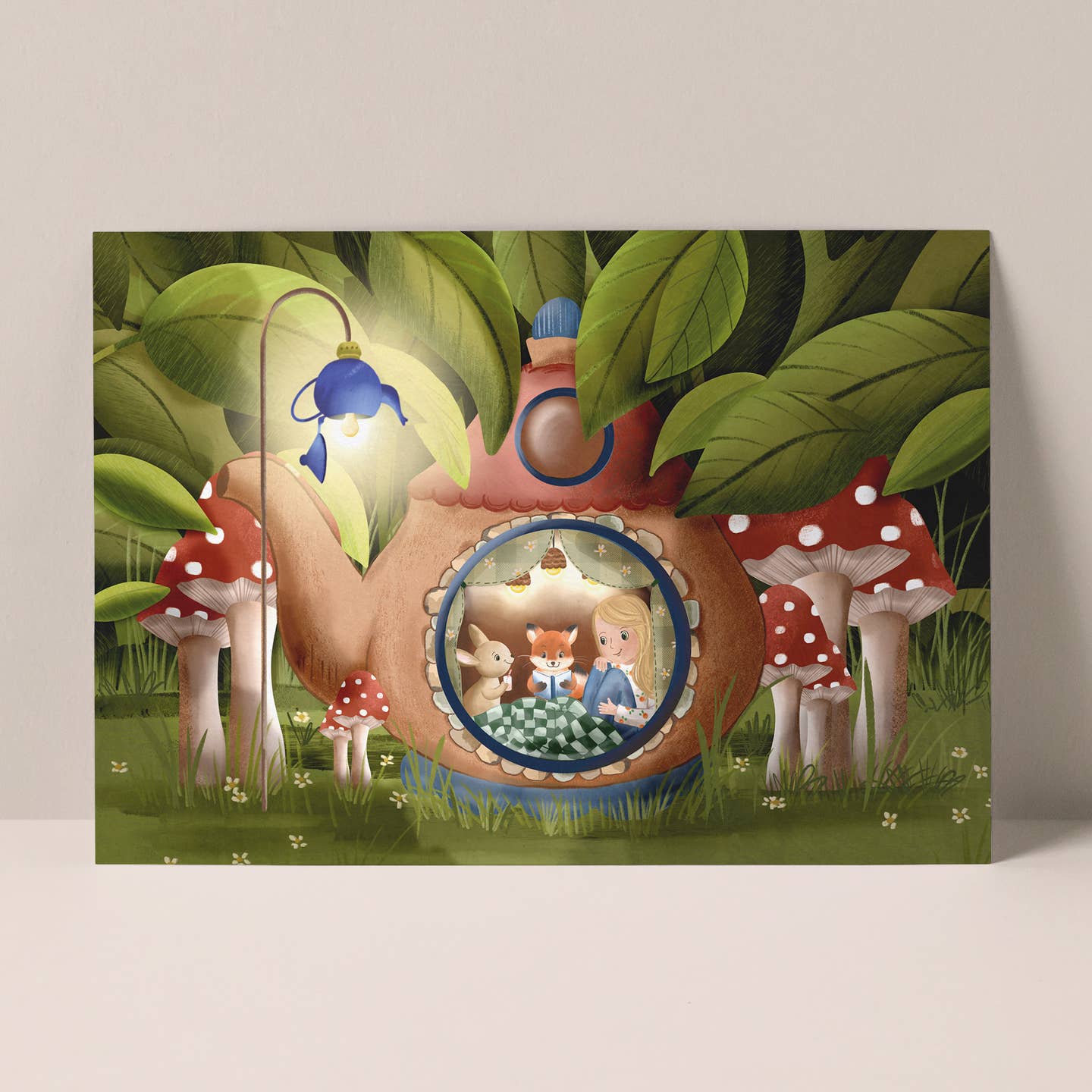 Verscholen in het bos, tussen de bladeren, ligt dit huisje in de vorm van een theepot. Gezelig samen knus in het huisje thee drinken. Collectie van fantasierijke kaarten, met veel kleur. Super om te versturen maar ook heel mooi voor een plekje in huis. Of in een lijstje op de baby of kinderkamer. Alle producten zijn met veel liefde handgetekend en ontworpen door Studio Poppybird en gedrukt bij een Nederlandse drukker.