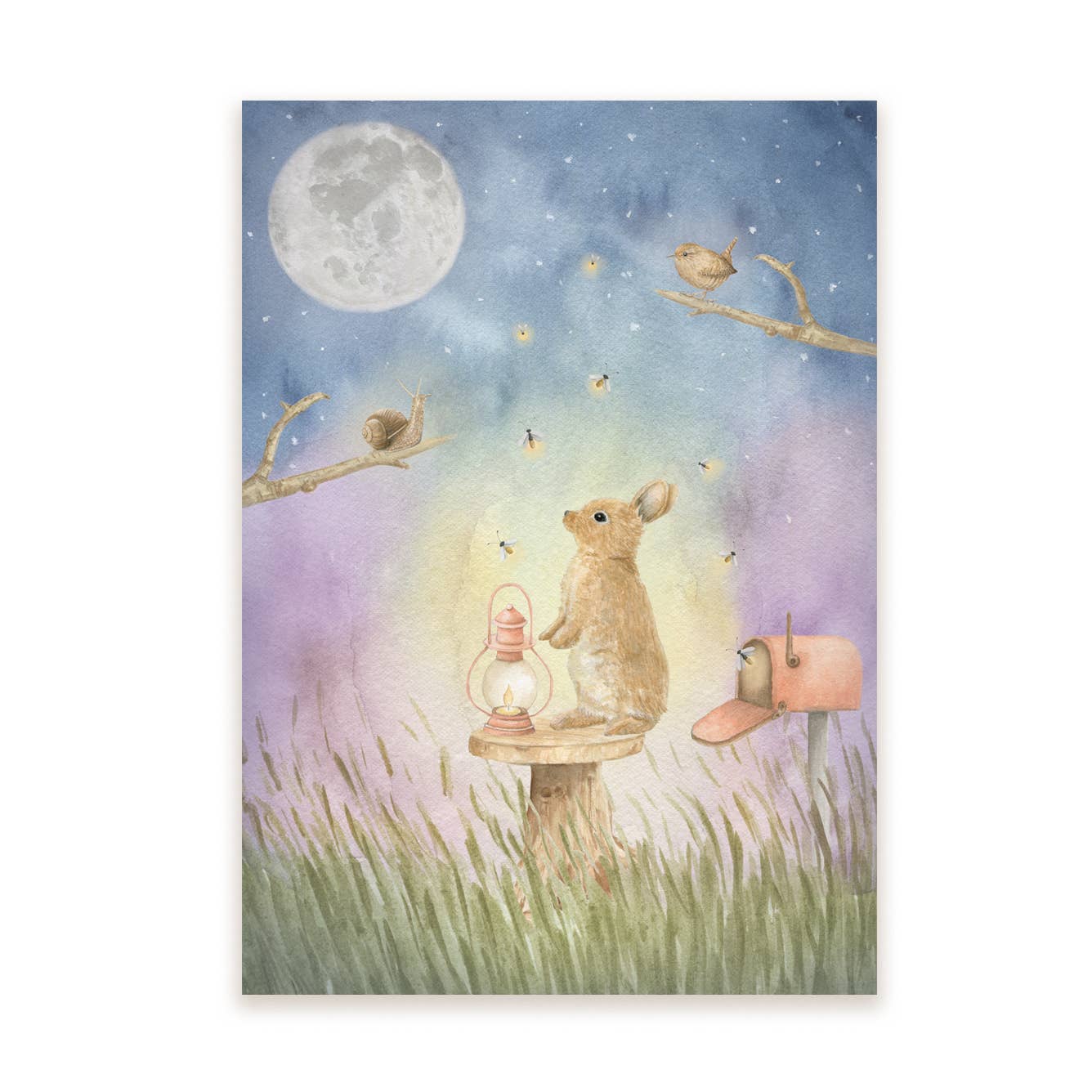 Laat je dierbaren stralen met deze magische postkaart! Het schattige konijntje bij het lampje, omringd door vuurvliegjes, een slak en een vogeltje onder een volle maan, brengt een betoverende sfeer. Perfect om een lieve boodschap te sturen of om als decoratie te gebruiken.
